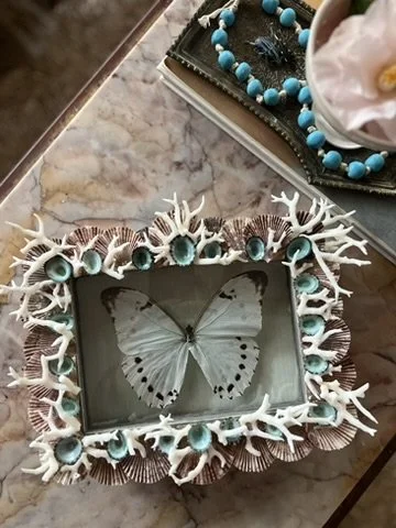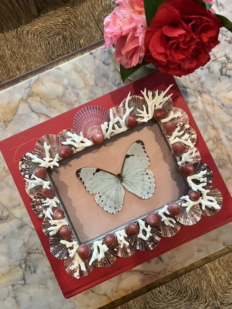 Looking for that special gift, look no further! With an array of hand wrapped frames in Florentine paper adorned with shells a mounted butterfly on paper or fabric, shell grotto julep cups, Nautilus shell napkin rings with French tassels and more. Reach out to discuss different options to fit your budget.